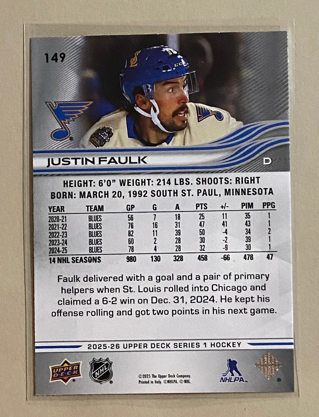 2025-26 Upper Deck 149 Justin Faulk - Hockey - Series 1