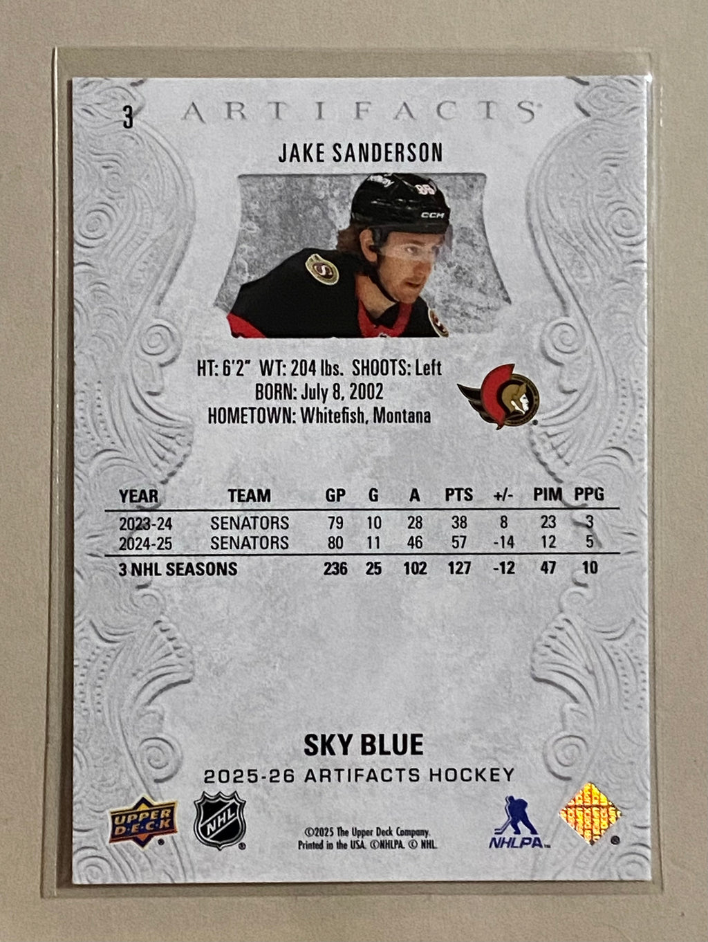 2025-26 Upper Deck 3 Jake Sanderson - Hockey - Artifacts - Sky Blue