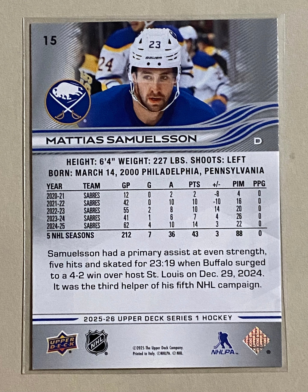 2025-26 Upper Deck 15 Mattias Samuelsson - Hockey - Series 1