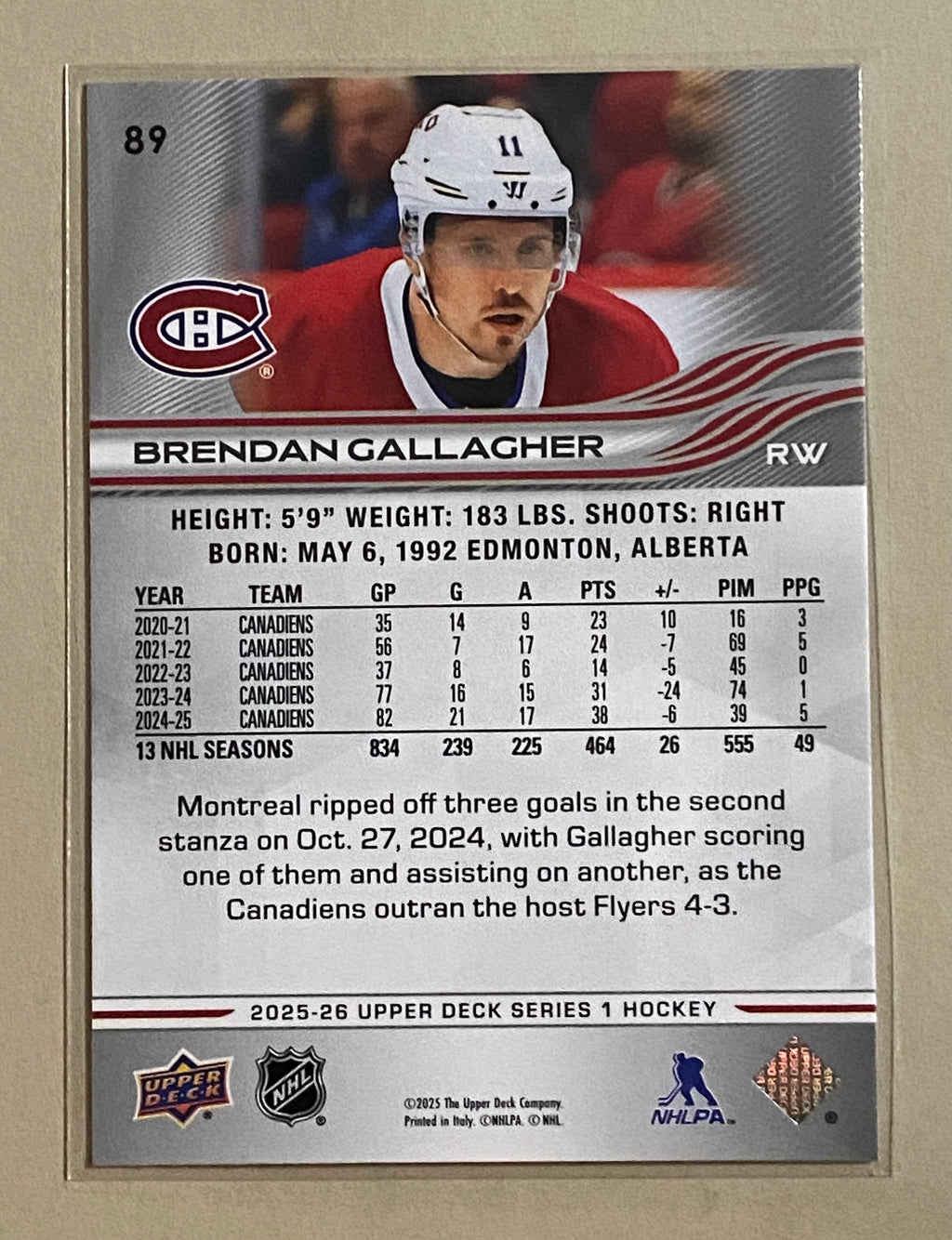 2025-26 Upper Deck 89 Brendan Gallagher - Hockey - Series 1